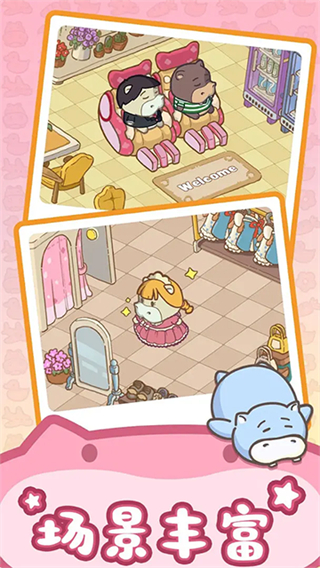 以小河马为核心的可爱角色设定,顾客形象呆萌有趣,互动对话充满欢乐,为经营过程增添治愈感与趣味性。