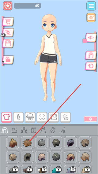 2、进入角色装扮界面后,找到底部展示的发型选项,点击红色箭头指向的发型样式,就能为角色更换对应的发型。