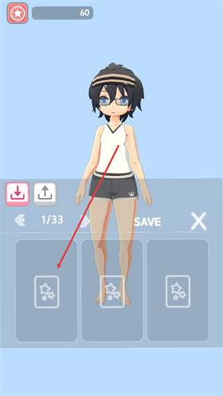 4、选择底部带星星标识的保存栏后,点击界面中的SAVE按钮,即可将当前设置的角色装扮效果进行保存。