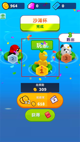 4、完成竞赛环节后,等待沙滩杯完成的结算界面出现,点击获得按钮领取对应的奖励。