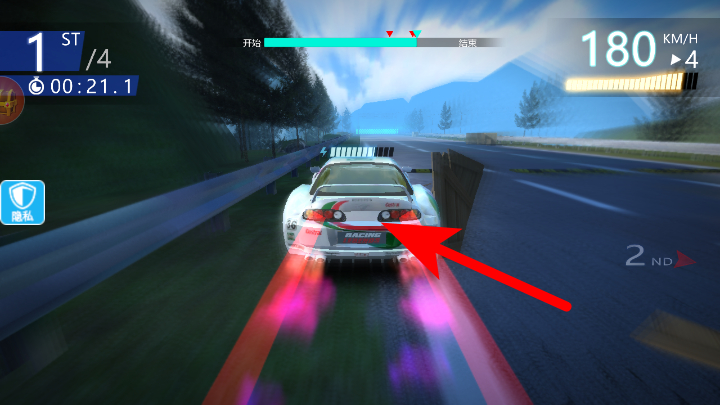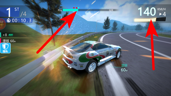 3、比赛中关注进度条与车速,借助漂移操作保持领先排名。