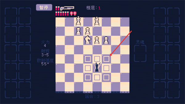 1、回合双向抉择:每一轮对战中玩家可自主选择移动国王位置或射击敌方棋子,射击后需再次移动完成霰弹枪装填,每一步决策都需兼顾进攻与防御,考验策略规划能力。