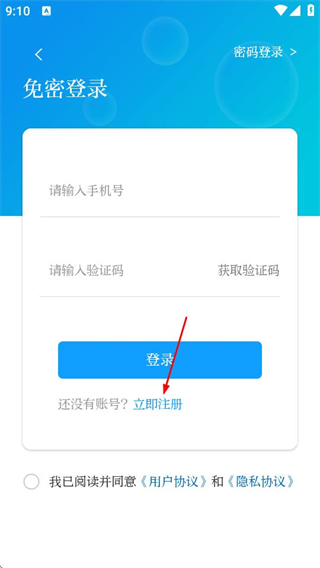 3、免密登录需输入手机号与验证码,无账号可点击注册。