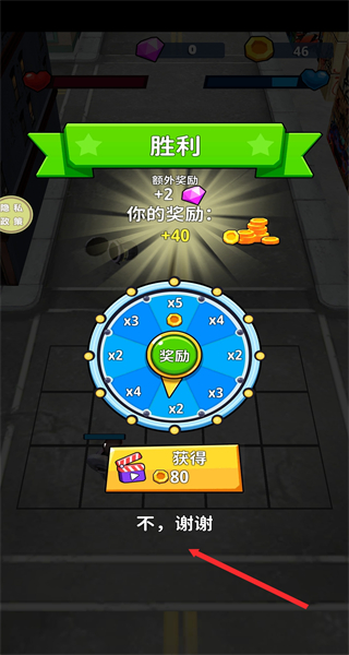 3、战斗胜利后,若不需要观看广告获取额外奖励,点击不谢谢按钮,领取基础奖励并推进到下一步。