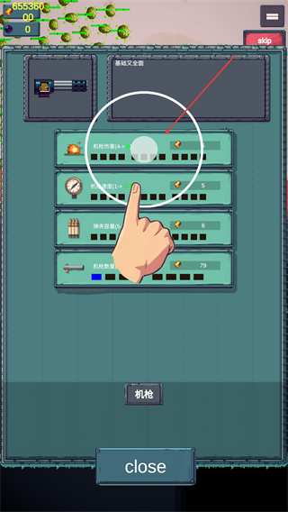 4、从机枪升级面板可知,需优先选择机枪伤害与机枪速度的升级项,这两项直接提升输出效率,能快速清理密集的外星生物。