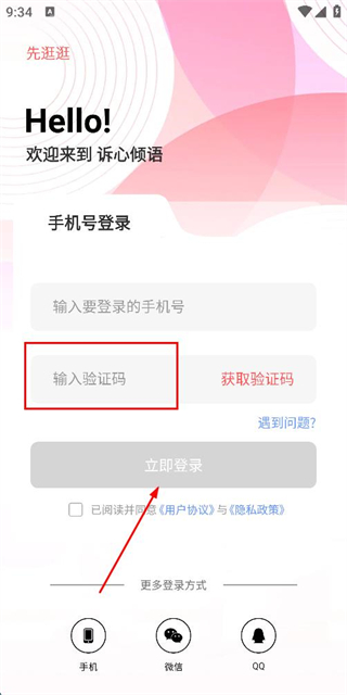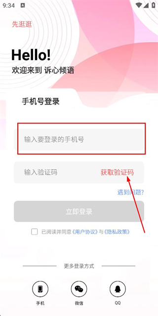 2、在登录页面填写手机号,勾选协议后,点击获取验证码。