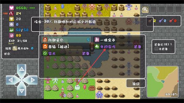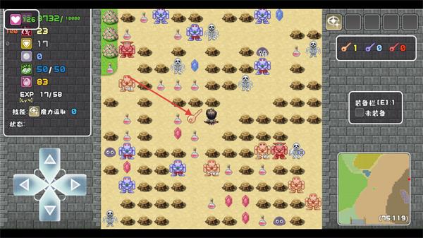 1、在该迷宫场景中,通过方向键操控角色移动,拾取场景内的钥匙,这是后面开启宝箱的重要道具,同时躲避或击败周围的怪物。