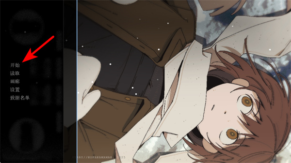 1、进入游戏主菜单后,点击红色箭头指向的开始选项,开启剧情流程,这是进入游戏的关键操作。