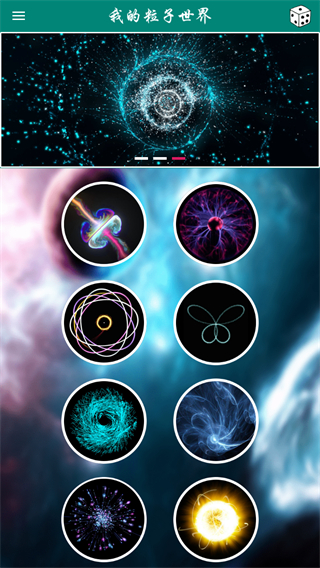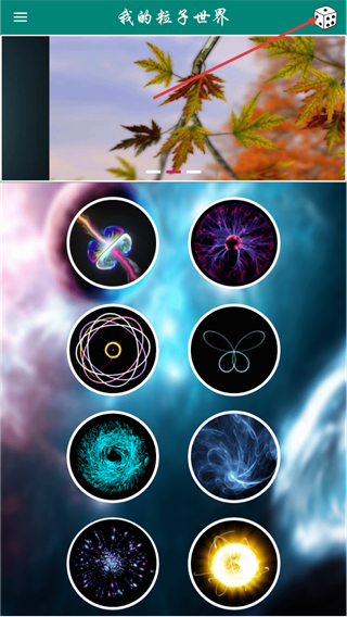 1、在我的粒子世界中,可选择下方不同样式的粒子效果,点击右上角的骰子按钮,即随机生成一种粒子世界。