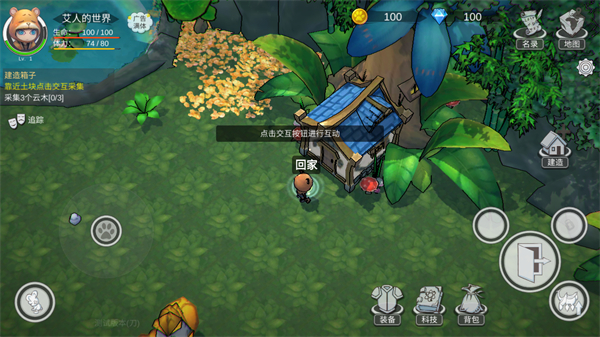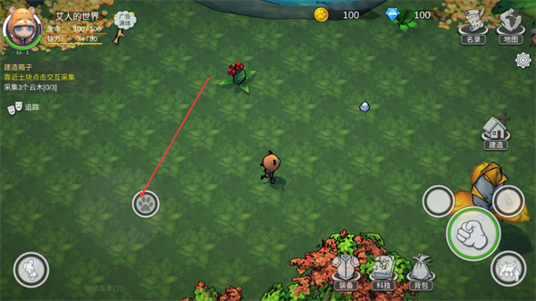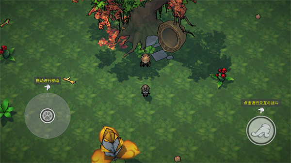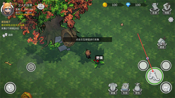 2、进入游戏主界面后,点击界面右侧的交互按钮,可对场景中的野果执行采集操作,推进建造箱子的任务进度。