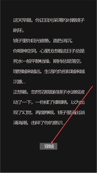 1、在游戏剧情界面,阅读完游戏背景的剧情内容后,点击界面底部的穿越按钮,即可进入游戏的后续流程。