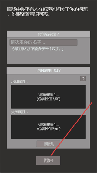 2、在该界面先确定不超五个汉字的名字,分配好属性后,点击下方的醒来按钮,即可推进游戏进程。