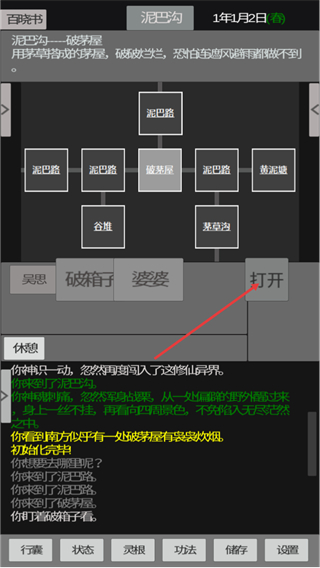 4、在泥巴沟的破茅屋场景中,找到界面里的破箱子,点击对应的打开按钮,可查看箱内物品。