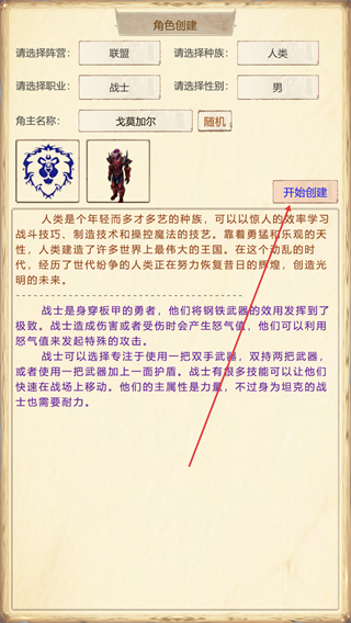1、创建角色选择联盟、人类、战士职业,输入名称后点击开始创建生成角色。