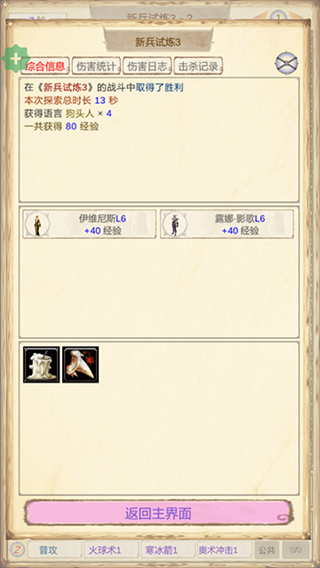 4、战斗胜利后获取装备、经验,点击返回主界面结束当前关卡。