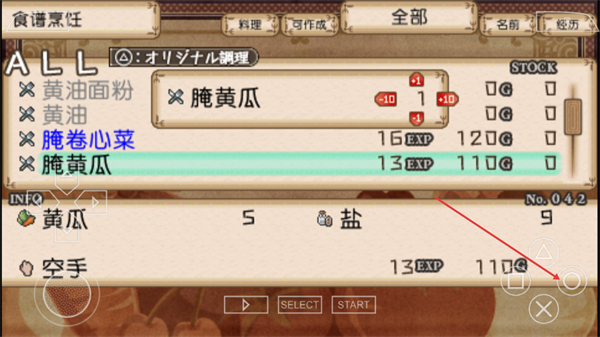 3、进入食谱烹饪界面,选中腌黄瓜料理选项,点击操作按钮,即可消耗对应食材进行该料理的制作。