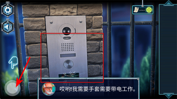 3、跟随红色箭头提示,点击对话界面的确认按钮,查看角色提示信息如需要手套,明确后续探索目标。
