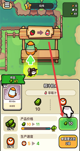 4、获得足够资金时可以点击榨汁机的升级按钮,消耗资金提升榨汁机的等级。