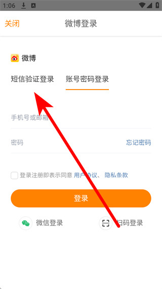 2、在微博登录页面中,点击短信验证登录选项,切换到短信验证登录的界面。