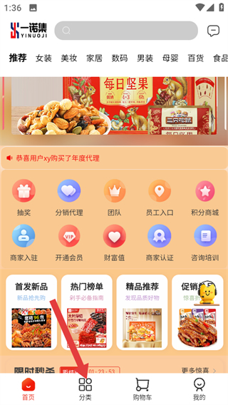 1、进入一诺集首页后,点击底部的分类按钮,可进入商品分类页面。
