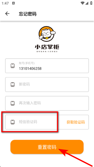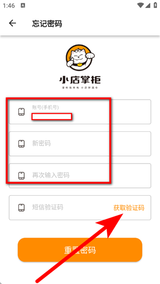 3、在忘记密码页面,输入手机号和设置密码,点击获取验证码。