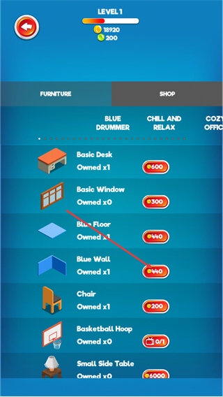 2、进入FURNITURE界面,找到BasicDesk、BlueWall等物品,消耗对应金币可获取,以此解锁装饰空间的家具。
