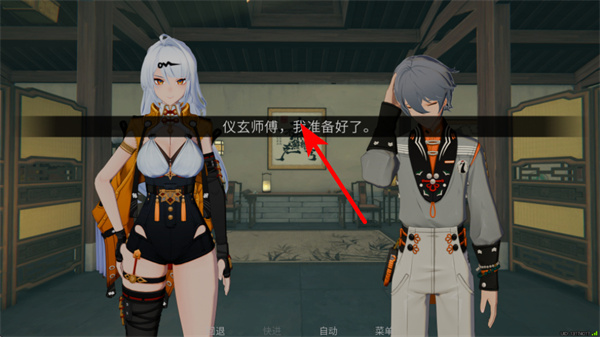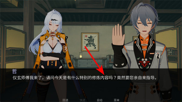 4、确认选择后,紧跟红色箭头指引,点击对话内容区域,触发后续的试炼流程,完成剧情推进。
