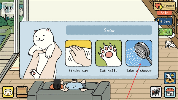 2、点击猫咪后弹出的界面里,选择Takeashower选项,即可进入给名为Snow的猫咪洗澡的互动环节。