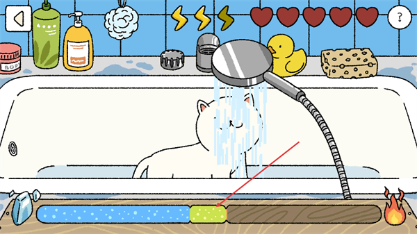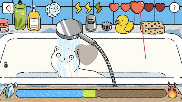 4、给猫咪洗澡过程中,上方的爱心标识亮起时,代表操作状态良好,继续维持进度即可完成洗澡。