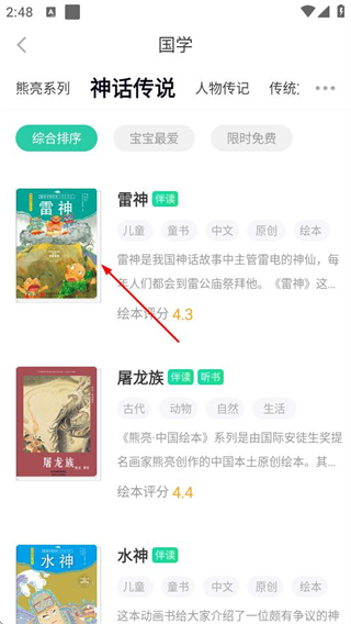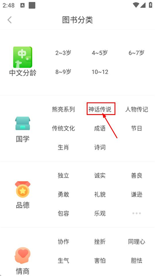2、在图书分类页面,选择国学分类下的神话传说选项,可进入对应绘本列表页。