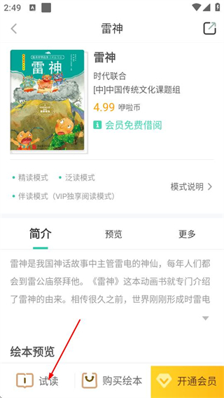 4、在绘本详情页面,点击试读按钮,即可开始阅读该绘本内容。