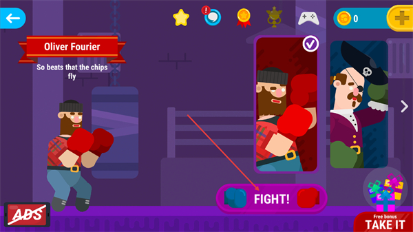 1、在该界面选择已解锁的角色OliverFourier,看到其提示语后,点击FIGHT按钮开启与下一位对手的对战。