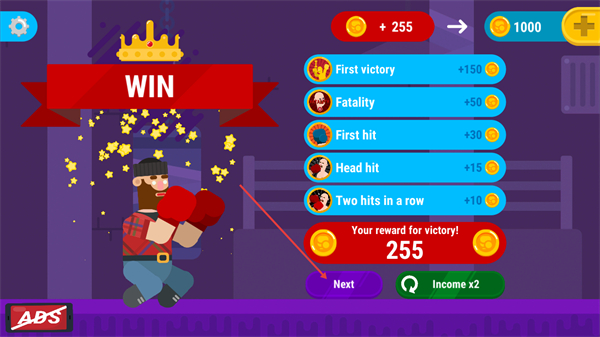 4、获得WIN胜利后,可查看Firstvictory、Fatality等对应的金币奖励,点击Next按钮进入下一轮对战准备界面。