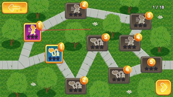 1、这是关卡选择界面,点击标有1的关卡可进入对应关卡,界面上的数字代表当前关卡级别,星星标识对应关卡完成评价。