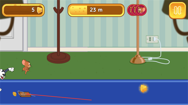 2、进入关卡后,留意顶部的5个奶酪数量与23m进度,向上滑动屏幕控制角色跳跃躲避地上的老鼠夹。