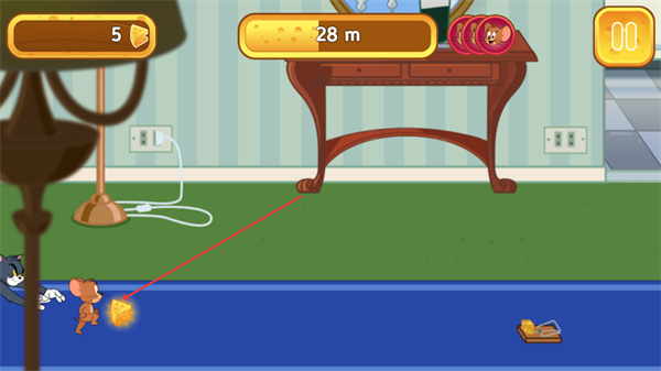 3、关卡进程中,收集奶酪可提升数量,当前进度推进至28m,继续躲避汤姆并收集物品以完成关卡目标。