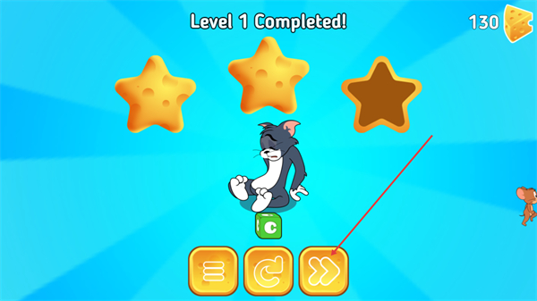 4、通过第一关后会显示星星评价,本次获得对应星级,点击箭头按钮即可进入下一个关卡的相关界面。