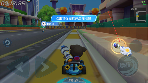 4、拾取赛道道具如导弹,点击导弹图标瞄准前方对手,干扰其行驶以巩固领先位置。