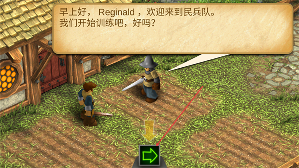 2、进入场景后,会收到民兵队长的对话提示,按绿色箭头指引推进训练流程。