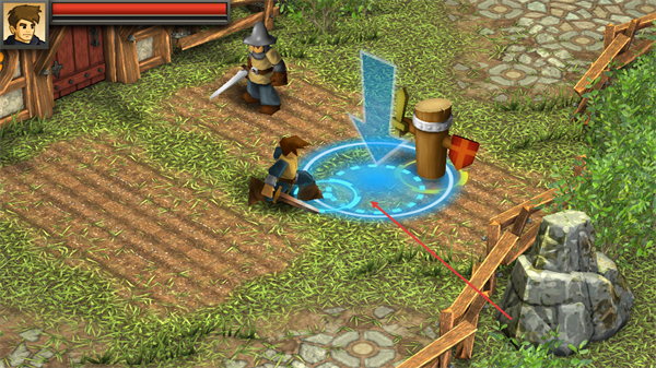 3、根据蓝色箭头提示,操控角色移动到木桩所在的蓝色区域,准备进行训练相关的操作。