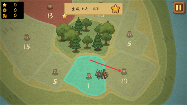 2、完成生成士兵5/5后,调动士兵部队,攻占数值为10的城池,扩张己方区域。
