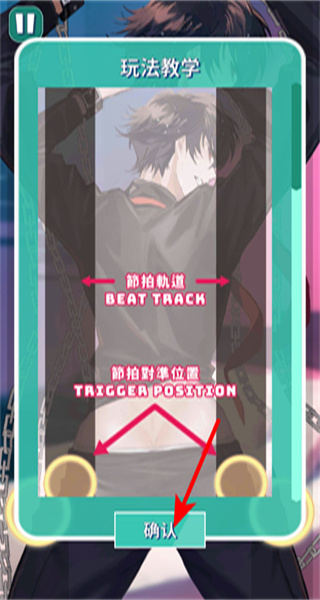 3、跟随红色箭头提示,点击确认按钮关闭玩法教学界面,熟悉游戏的操作规则如节拍轨道、触发位置。