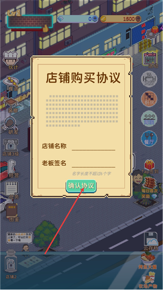 1、在店铺购买协议界面填写店铺名称和老板签名,保证名称长度不超6字,点击确认协议即可完成店铺的创建。