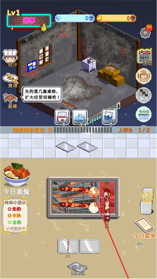从食材处理到顾客用餐的全流程模拟,搭配贴合场景的音效与视觉呈现,营造出深夜烧烤店的热闹氛围,让人直观感受从默默无闻到门庭若市的乐趣。