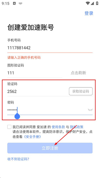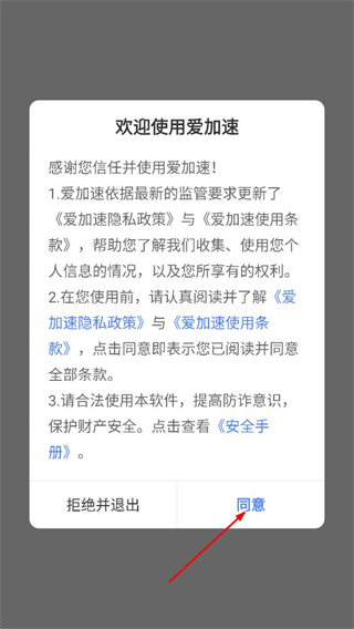 1、在阅读爱加速隐私政策与爱加速使用条款后,点击同意,进入创建账号页面。