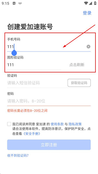 2、在创建爱加速账号页面,填写手机号码和图形验证码,准备后续注册操作。