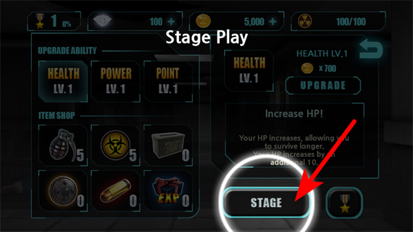 1、进入游戏准备界面后,点击红色箭头指向的STAGE按钮,开启丧尸关卡流程,进入游戏的关键操作。