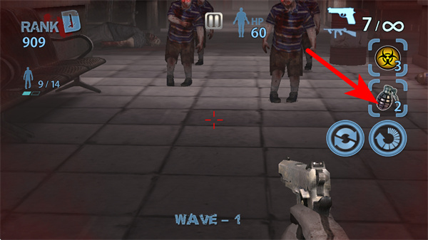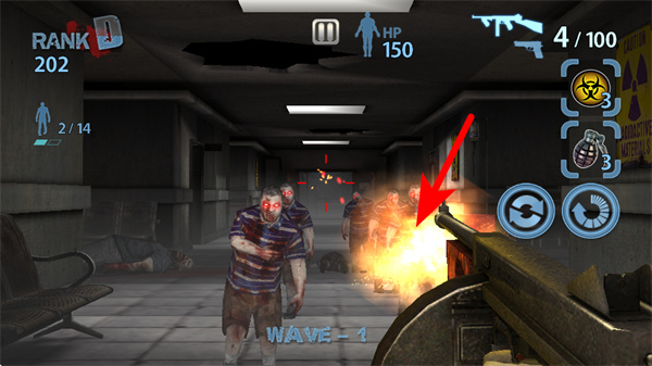 2、在战斗场景中,依照红色箭头指引,瞄准前方丧尸进行射击,清除当前波次的敌人,推进关卡进度。