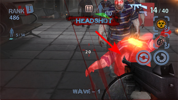 3、跟随红色箭头提示,瞄准丧尸头部触发HEADSHOT爆头,提升伤害效率,削减数量降低自身受伤风险。
