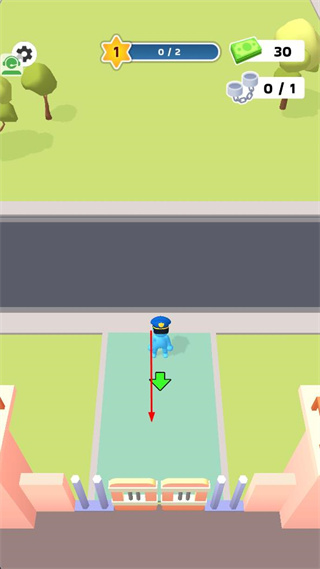 1、进入游戏关卡,按照箭头提示操控蓝色警察角色,向下方监狱大门方向移动。